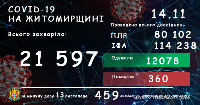 Станом на 09:00 год. 14 листопада у Житомирській області лабораторно підтверджено 21597 випадків коронавірусної хвороби. Зокрема, за минулу добу, 13 листопада, COVID-19 підтвердили в 459 осіб. За період пандемії зафіксували 360 летальних випадків, в тому числі 16 – протягом минулої доби. Хворобу подолали 12078 пацієнтів, за добу зареєстрували 551 випадок одужання.