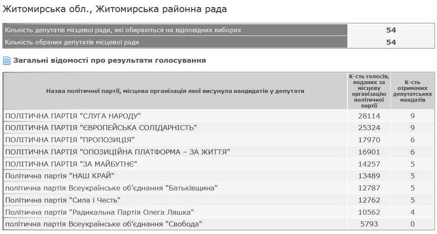 З десяти партій, які висували своїх кандидатів до Житомирської районної ради, прохідний бар’єр у 5% не подолала лише «Свобода».