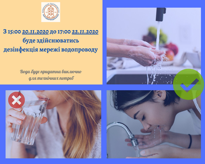 «Звертаємо вашу увагу, що з 15:00 год. 20.11.2020 до 17:00 год. 22.11.2020 буде здійснюватись дезінфекція мережі водопроводу. У цей час не рекомендується використовувати воду для приготування їжі, водночас вона придатна для прання, миття посуду та гігієнічних процедур», – йдеться у повідомленні.