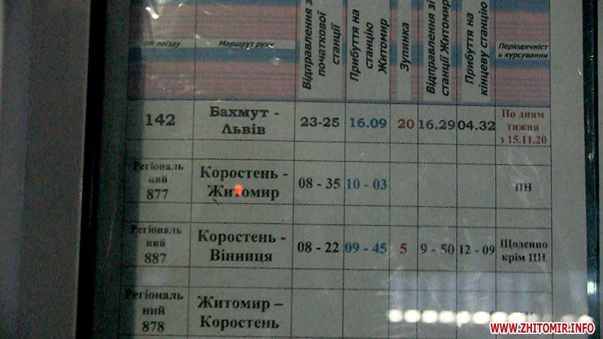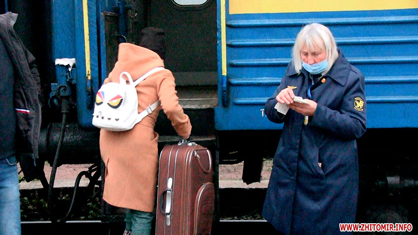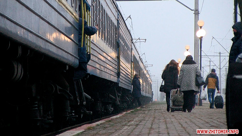У середу 18 листопада близько 16-ї години на житомирському залізничному вокзалі кілька десятків людей: пасажири чекають на два потяги, які прямують до Львова та до Коростеня. Із 13 листопада Укрзалізниця відновила маршрут пасажирського потягу «Львів-Бахмут», який йде через Житомир. Потяг курсує один раз на три дні.