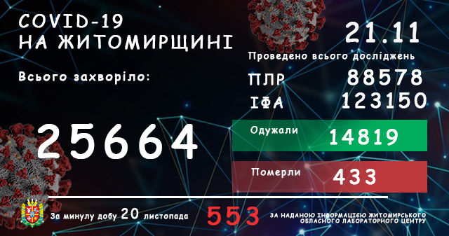 Як повідомляв Житомир.info, станом на 09:00 год. 20 листопада 2020 року в Житомирській області лабораторно підтвердили 25111 випадків коронавірусної хвороби, з них за минулу добу, 19 листопада – 569 нових.