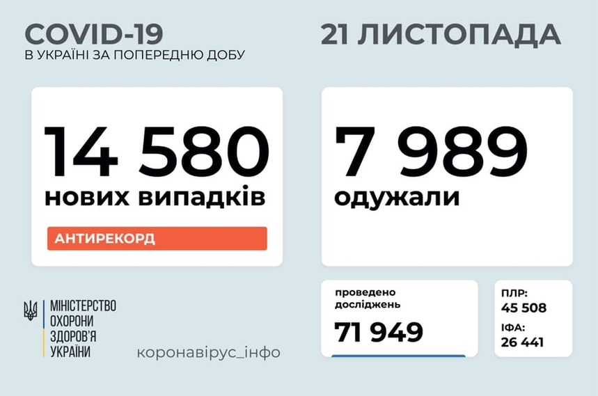 За інформацією МОЗ, в Україні станом на 21 листопада 2020 року зафіксовано 14 580 нових випадків коронавірусної хвороби COVID-19. Зокрема, захворіли 610 дітей та 590 медпрацівників. Також за минулу добу: госпіталізовано – 1 761 особу; летальних випадків – 215; одужало – 7 989 осіб; здійснено тестувань за добу – 71 949 (зокрема, методом ПЛР – 45 508, методом ІФА – 26 441).