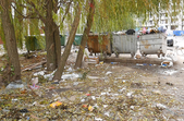 Старі залізні сміттєві баки поруч із новими пластиковими та контейнери, які виставили на траву – такий вигляд зараз мають майданчики збору побутових відходів на Крошні.