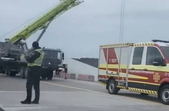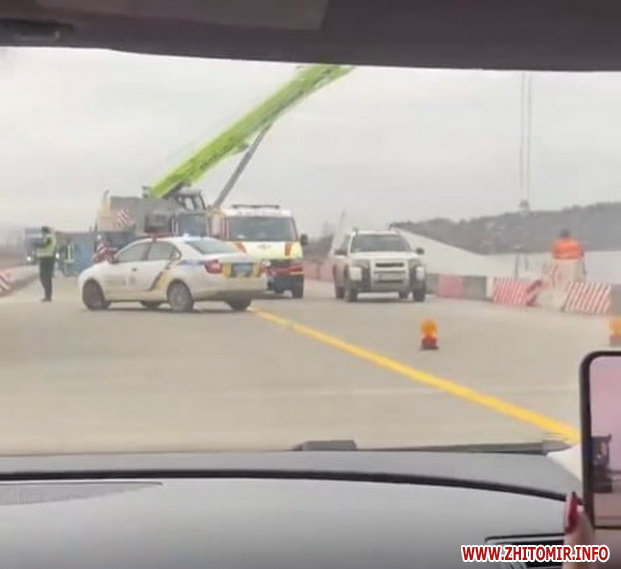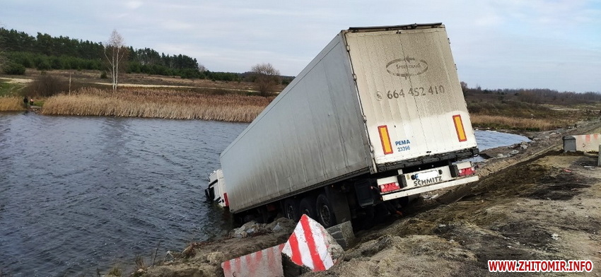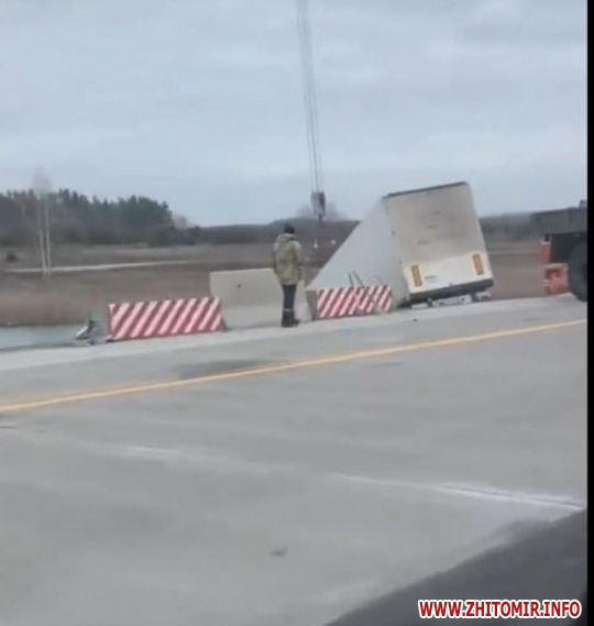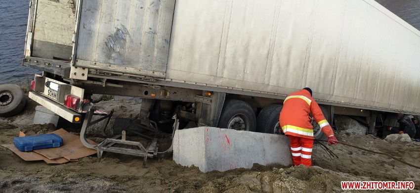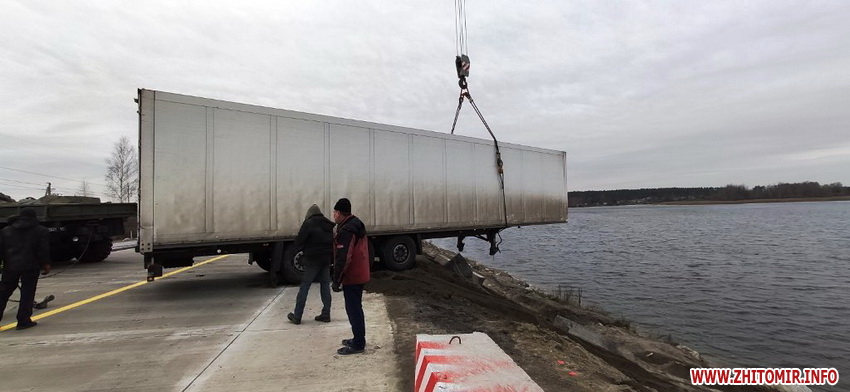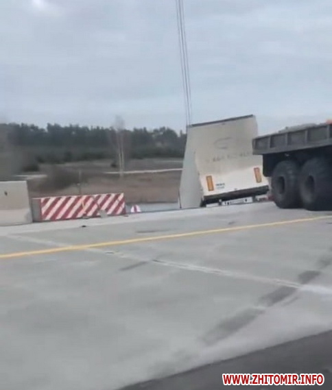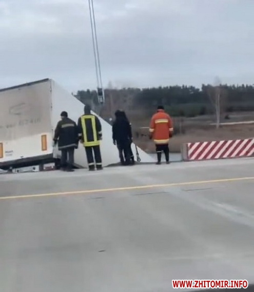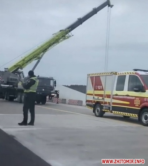 На сторінці h****y_zhytomyr у соціальній мережі очевидці розмістили коротке відео, на якому видно, як кран намагається підняти фуру. На місці є автомобіль рятувальників.