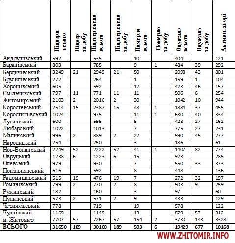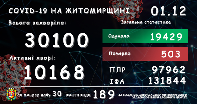 Станом на 09:00 год. 1 грудня в Житомирській області лабораторно підтвердили 30100 випадків коронавірусної хвороби. За минулу добу, 30 листопада, зареєстрували 189 інфікувань. За період пандемії від ускладнень COVID-19 померли 503 жителі області, у тому числі 6 – за минулу добу. Одужали загалом 19 429 пацієнтів.