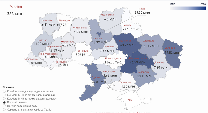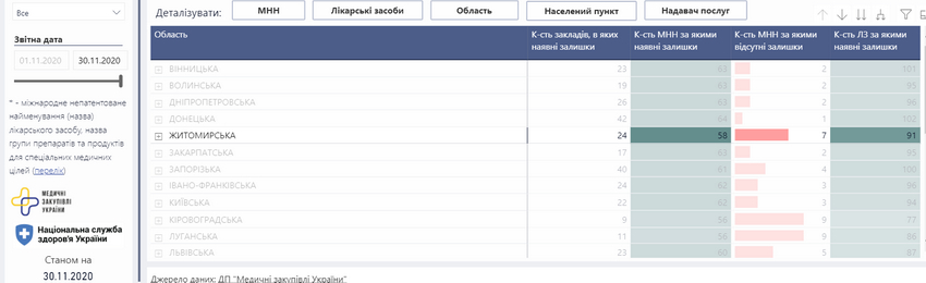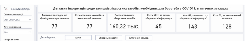 «Станом на 29 листопада відзвітували про залишки 114 форм лікарських засобів 588 лікарень. Також на дашборді за кожним найменуванням можна побачити не тільки поточний залишок у певній лікарні, а його приріст за добу, середній залишок за сім днів, кількість закладів, де є певний препарат у наявності та інше. Щодо наявності залишків, необхідних для боротьби з COVID-19, в аптеках, то відзвітували 2570 аптечних закладів. У них наявні 143 форми ліків 45 МНН. Перелік аптечних мереж із залишками таких препаратів також можна побачити на дашборді НСЗУ», – йдеться у повідомленні.