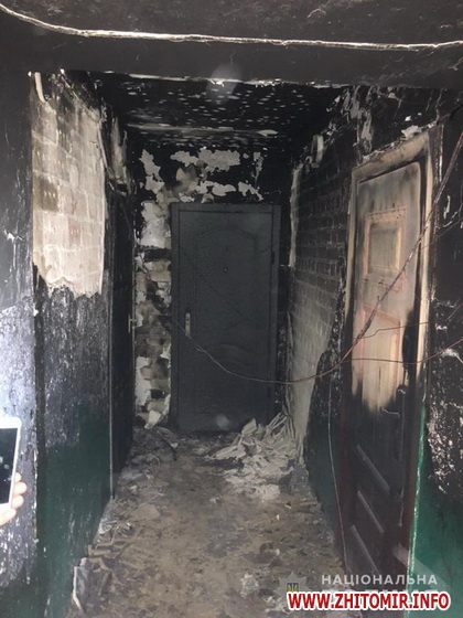 «Повідомлення про пожежу надійшло близько 2:55 від рятувальників. На місці події працівники слідчо-оперативної групи Житомирського відділу з’ясували, що осередок пожежі був у під’їзді на другому поверсі, де розташовані вхідні двері до 5 квартир. У результаті загоряння було пошкоджено стіни та двері вказаних осель», – йдеться у повідомленні.