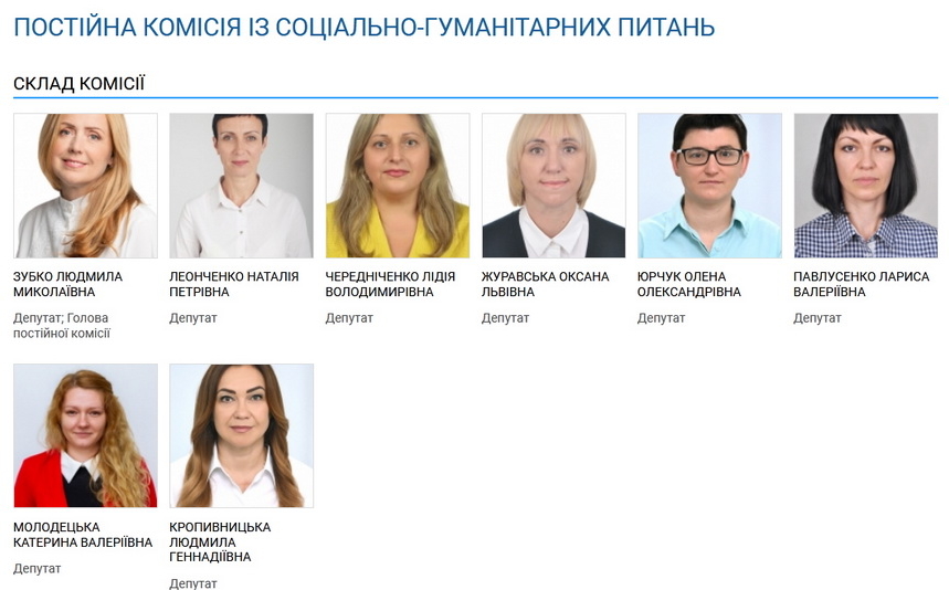Третьою за чисельністю є комісія з соціально-гуманітарних питань, яку очолює Людмила Зубко (фракція партії «Європейська Солідарність»). Цікаво, що всі вісім членів цієї комісії – жінки.