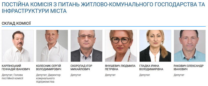 У складі комісії з питань житлово-комунального господарства та інфраструктури міста всього сім депутатів, очолює її Геннадій Карпінський (фракція партії «Європейська Солідарність»).
