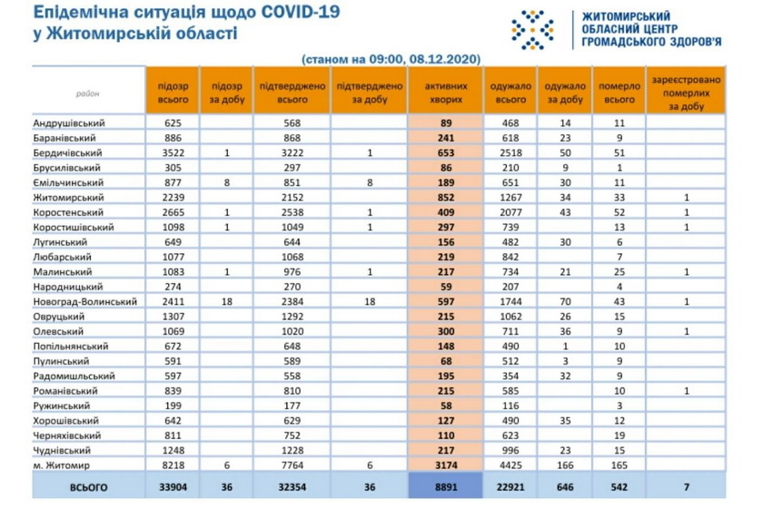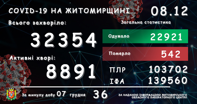 Станом на 09:00 год. 8 грудня у Житомирській області лабораторно підтвердили 32354 випадків коронавірусної хвороби. За минулу добу, 7 грудня, зареєстрували 36 нових інфікувань. За період пандемії померли 542 особи, у тому числі минулої доби було зафіксовано 7 летальних випадків. Одужав загалом 22921 пацієнт.