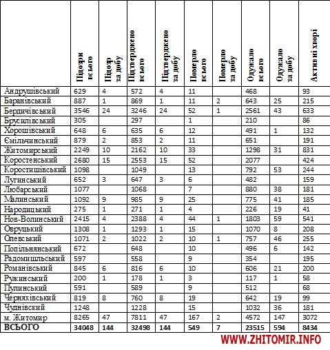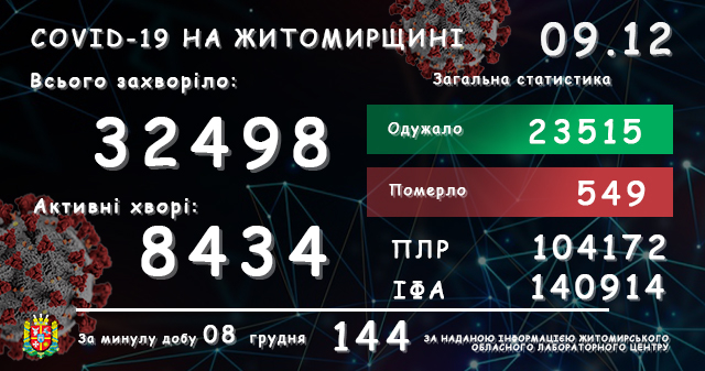 Станом на 9:00 год. 9 грудня в Житомирській області лабораторно підтверджено 32498 випадків коронавірусної хвороби. За минулу добу, 8 грудня, зареєстрували 144 інфікування. За період пандемії померли 549 осіб, у тому числі за минулу добу зафіксовано 7 летальних випадків. Одужали загалом 23515 пацієнтів.