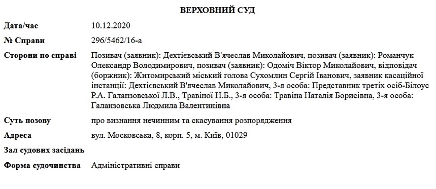 Касаційний адміністративний суд Верховного суду України розглядає касаційну скаргу на постанову Корольовського районного суду м. Житомира від 03.10.2017 та постанову Житомирського апеляційного адміністративного суду від 28.02.2018 у справі за позовом В'ячеслава Дехтієвського, Олександра Романчука та Віктора Одоміча до Житомирського міського голови Сергія Сухомлина про визнання нечинним та скасування розпорядження, який вулиці Маликова повернули стару назву і скасували перейменування на вул.Сурина гора.