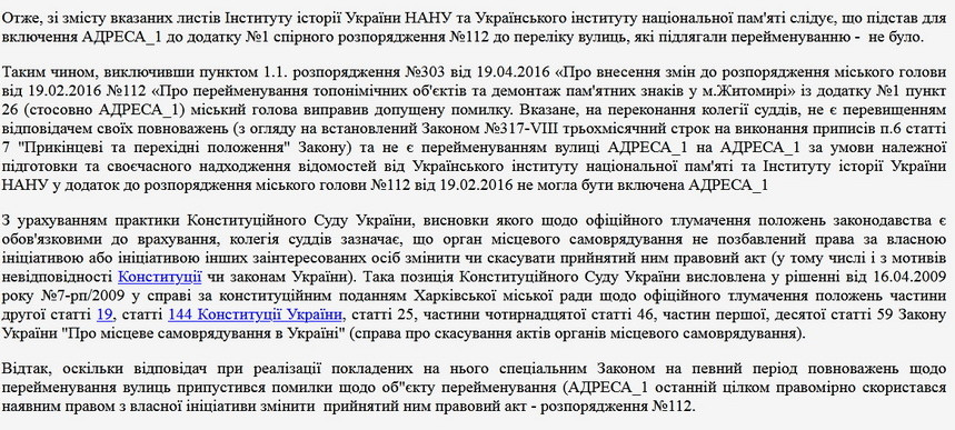 Нагадаємо, в червні 2016 року громадяни Дехтієвський, Одоміч та Романчук звернулися до суду з позовною заявою, якою просили скасувати розпорядження міського голови №303 «Про внесення змін до розпорядження міського голови від 19.02.2016 №112 «Про перейменування топонімічних об'єктів та демонтаж пам’ятних знаків у м.Житомирі»» від 19.04.2016 з пунктом 1.1 про виключення із додатка 1 (до розпорядження №112) пункту 26 (щодо вулиці Маликова). Корольовський районний суд м.Житомира 3 жовтня 2017 року відмовив у задоволенні позову. На це рішення суду першої інстанції подали апеляцію, але постановою від 28 лютого 2018 року Житомирський апеляційний адміністративний суд залишив скаргу без задоволення, а постанову Корольовського райсуду – без змін.