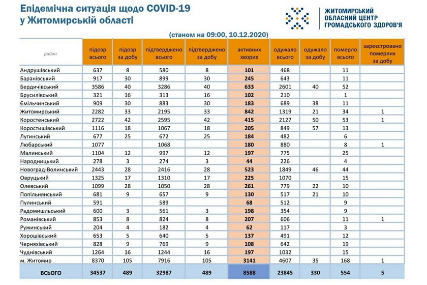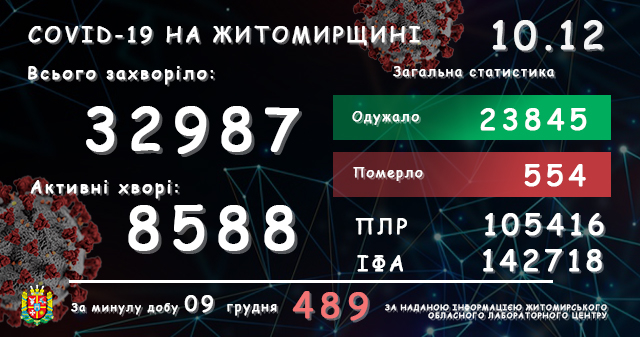 Станом на 9:00 год. 10 грудня у Житомирській області лабораторно підтвердили 32987 випадків коронавірусної хвороби. За минулу добу, 9 грудня, зареєстрували 489 нових інфікувань. За період пандемії від ускладнень COVID-19 померли 554 особи, у тому числі минулої доби було зафіксовано 5 летальних випадків. Одужало загалом 23845 пацієнтів.