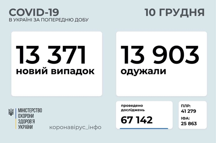 За даними Міністра охорони здоров’я Максима Степанова, станом на 10 грудня 2020 року в Україні зафіксовано 13 371 новий випадок коронавірусної хвороби COVID-19. Зокрема, захворіли 652 дитини та 580 медпрацівників.