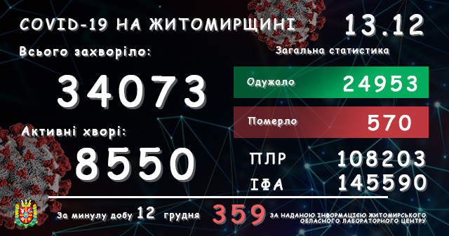 Станом 09:00 год. 13 грудня в Житомирській області лабораторно підтверджено 34073 випадків коронавірусної хвороби. За минулу добу, 12 грудня, зареєстрували 359 нових випадків. За період пандемії померли 570 пацієнтів, двоє – за минулу добу. Одужали загалом 24953 осіб.