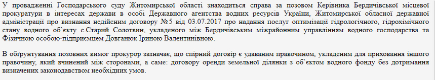 У Єдиному державному реєстрі судових рішень опублікована ухвала Господарського суду Житомирської області по даній справі, у якій зазначено, що договір про надання послуг оптимізації гідрологічного, гідрохімічного стану водного об’єкта в селі Старий Солотвин було укладено 3 липня 2017 року між Бердичівським міжрайонним управлінням водного господарства та ФОП Довганюк Іриною Валентинівною.