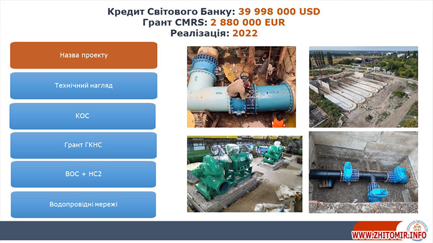 «Як ви знаєте, наше підприємство має кредит Світового банку і має грант на реконструкцію головної каналізаційної насосної станції. Я зараз стисло повідомлю, які об'єкти ми реконструюємо. Це будівництво нових очисних споруд каналізацій, які у нас знаходяться на вулиці Промисловій, будівництво нових очисних споруд води і найбільшої водопровідної насосної станції нашого міста, яка знаходиться на вулиці Чуднівська, 120. Це і реконструкція водопровідних мереж міста 9,5 км та дюкерних переходів. Також ми маємо грант від словенського уряду на 2, 9 млн євро на реконструкцію головної каналізаційної насосної станції. Наразі нам необхідно побудувати каналізаційний напірний колектор, щоб з'єднати головну каналізаційну насосну станцію з очисними спорудами каналізації», – сказав директор КП «Житомирводоканал» Андрій Нікітін.