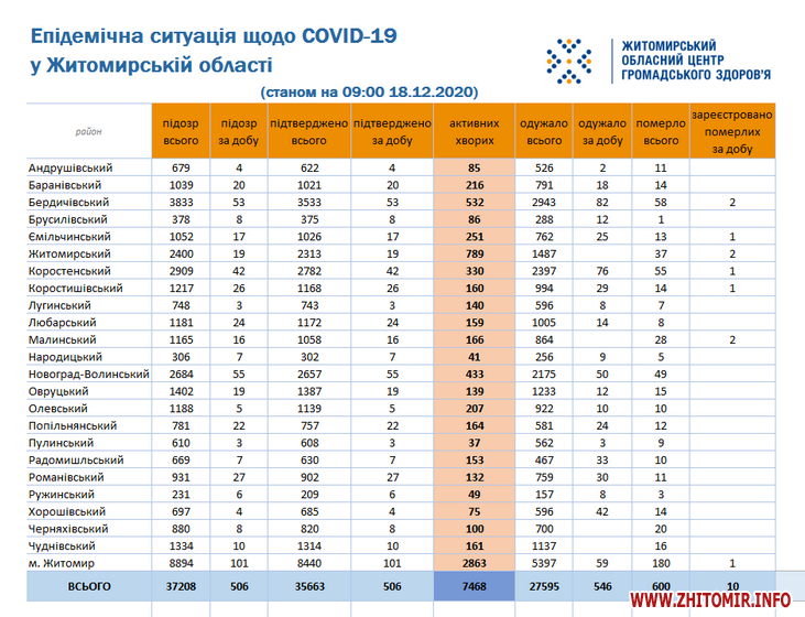 Станом на 09:00 год. 18 грудня в Житомирській області лабораторно підтвердили 35663 випадки коронавірусної хвороби. За минулу добу, 17 грудня, зареєстровано 506 нових інфікувань. Від ускладнень COVID-19 померли загалом 600 жителів області, у тому числі минулої доби було зафіксовано 10 летальних випадків. Одужало загалом 27595 пацієнтів.