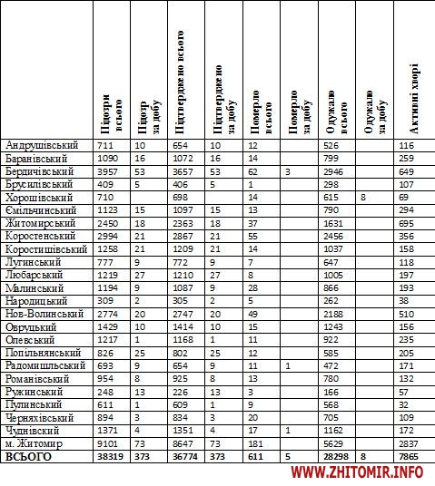 Станом на 09:00 год. 21 грудня в Житомирській області лабораторно підтверджено 36774 випадків коронавірусної хвороби. За минулу добу, 20 грудня, зареєстрували 373 нових випадків. За період пандемії померло 611 пацієнтів, у тому числі 5 – минулої доби. Одужало загалом 28298 осіб.