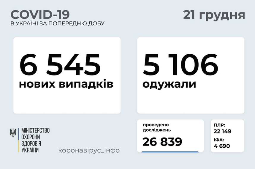 За даними Міністра охорони здоров’я Максима Степанова, станом на 21 грудня 2020 року в Україні зафіксовано 6 545 нових випадків коронавірусної хвороби COVID-19. Зокрема, захворіли 292 дитини та 236 медпрацівників.