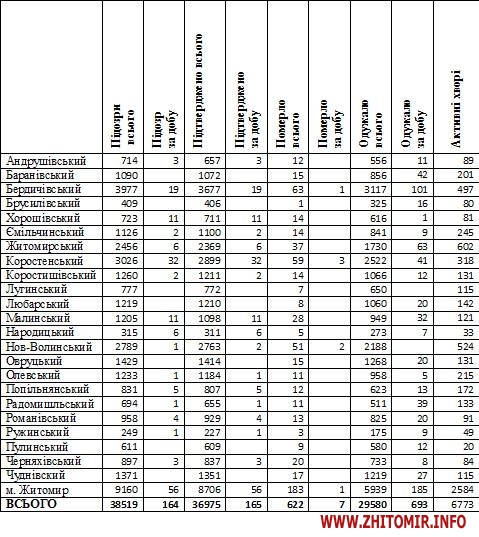 Станом на 09:00 год. 23 грудня в Житомирській області лабораторно підтвердили 36975 випадків коронавірусної хвороби. За минулу добу, 22 грудня, зареєстрували 165 нових інфікувань. За період пандемії від ускладнень COVID-19 померли 622 пацієнти, минулої доби зафіксували 7 летальних випадків. Одужало загалом 29580 осіб.