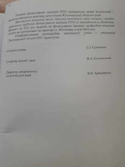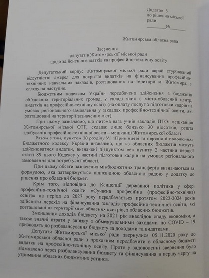 «Депутати Житомирської міської ради звернулися 05.11.2020 року до Житомирської обласної ради з проханням передбачити в обласному бюджеті видатки на професійно-технічну освіту. Проте у задоволенні звернення було відмовлено через розбалансування бюджету та фінансування в першу чергу на утримання обласних установ. Питання фінансування закладів ПТО залишається вкрай актуальним і вимагає повторного розгляду депутатами Житомирської обласної ради», - йдеться у зверненні.