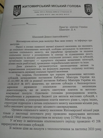 Депутати Житомирської міської ради звернуться з листом до прем’єр-міністра Дениса Шмигаля з закликом розглянути питання стосовно фінансування виплати пільг, субсидій, державних соціальних допомог.