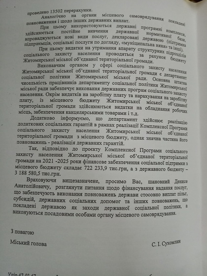 Депутати акцентують, що при цьому «використовуються державні програмні комплекси, здійснюється постійне вивчення державної нормативної бази, впроваджуються нові види послуг, декларовані державою (підтримка підприємців, соціальні послуги по догляду, «муніципальна няня» та інші).При цьому видатки на утримання апарату структурних підрозділів соціального захисту населення проводяться за рахунок бюджету Житомирської міської об’єднаної територіальної громади».