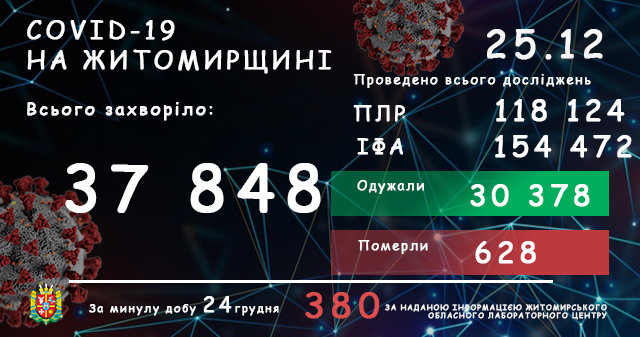За минулу добу, станом на 9 ранку 25 грудня, у Житомирській області лабораторно підтверджено 380 нових випадків коронавірусної хвороби, 5 пацієнтів померли.