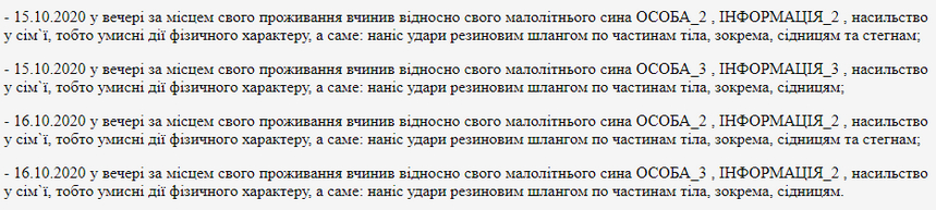 Дітей оглянув лікар-педіатр, у них були виявлені фізичні ушкодження, зокрема, «у ділянці сідниць та стегон, які були повністю збиті, наявні кров`яні синці». Діти у присутності психолога пояснили, що в їхній родині це вважається нормою, тобто батько їх б`є. А 15 та 16 жовтня, коли були вихідні, вони пішли гуляти, вийшли з двору. Це не сподобалось батькові, він завів їх до кімнати, сказав лягти на ліжко та зняти штани. Взявши резиновий шланг, чоловік попередив, що буде бити по 40 разів кожного.