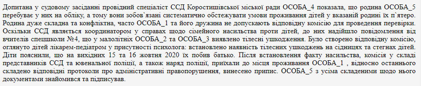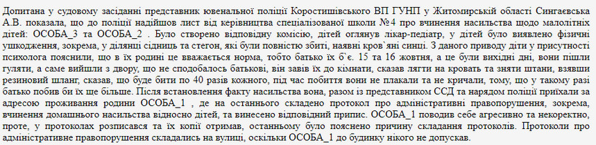 Представник ювенальної поліції Коростишівського ВП ГУНП у Житомирській області розповіла у суді, що про вчинення насильства стосовно дітей стало відомо з листа, який надійшов зі школи.