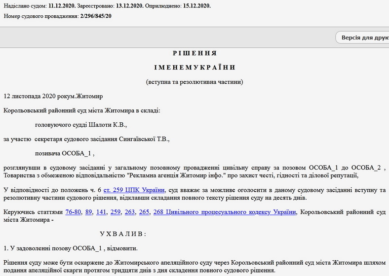 Рішення суду було ухвалене 12 листопада 2020 року, вступна та резолютивна частини оприлюднені в Єдиному державному реєстрі судових рішень лише 15 грудня, а повний текст рішення станом на 29 грудня не оприлюднений.