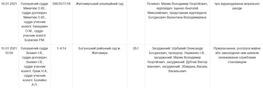 Загалом Корольовський районний суд зараз розглядає ще три справи за позовами Малика. Ще одна справа про стягнення моральної шкоди знаходиться в апеляційному суді, а в Богунському районному суді Житомира триває розгляд справи, де Володимир Малик є одним з обвинувачуваних в розтраті майна.