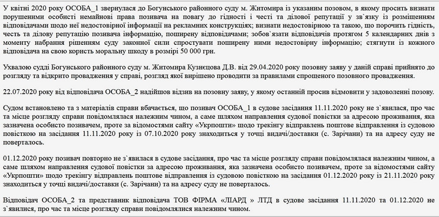 Нагадаємо, підставою звернення до суду стало розміщення в Житомирі інформації на білбордах зі згадуванням прізвища Чиж, яка на той час була секретарем Житомирської міської ради. У позовній заяві вимагалося визнати недостовірною та такою, що порочить гідність, честь та ділову репутацію позивача інформацію, поширену відповідачами; зобов`язати відповідачів протягом 5 календарних днів з моменту набрання рішенням суду законної сили спростувати поширену ними недостовірну інформацію; стягнути з відповідачів моральну шкоду в розмірі по 50 тис. грн.