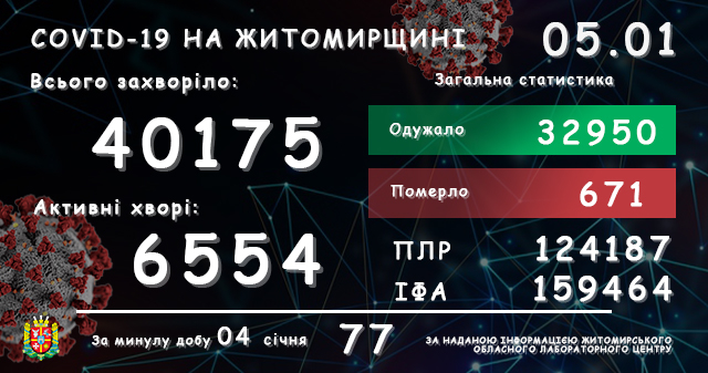 Станом на ранок 5 січня у Житомирській області лабораторно підтверджено 40175 інфікувань COVID-19, зафіксовано 671 летальний випадок. Зокрема, за минулу добу, 4 січня, виявили 77 нових випадків коронавірусу, від ускладнень померли 6 жителів області.