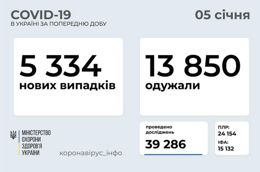 За даними пресслужби Міністерства охорони здоров’я, 5 334 нових випадки коронавірусної хвороби COVID-19 зафіксовано в Україні станом на 5 січня 2021 року.