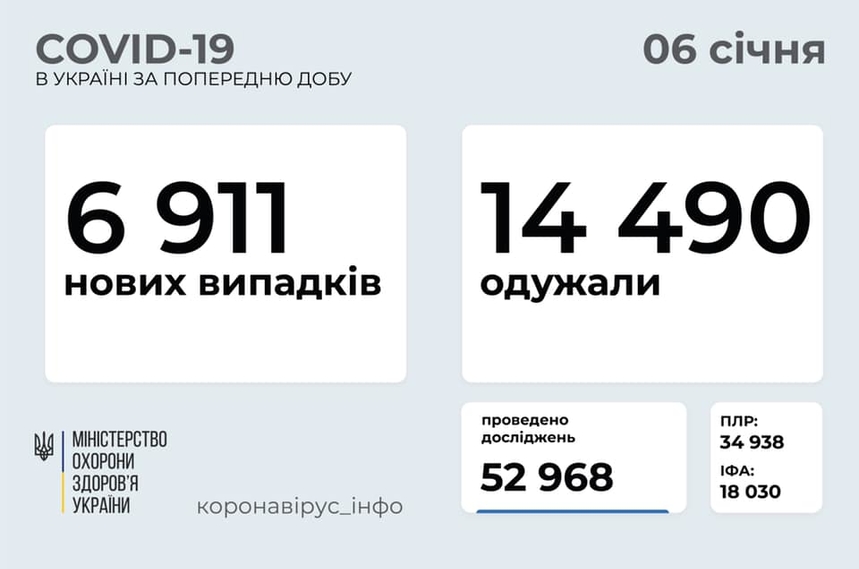 За даними Міністра охорони здоров’я Максима Степанова, станом на 6 січня 2021 року (за добу 5 січня) в Україні зафіксовано 6 911 нових випадків коронавірусної хвороби COVID-19. Зокрема, захворіли 203 дитини та 406 медпрацівників.