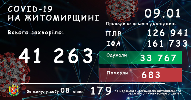 Як повідомляв Житомир.info, станом на 09:00 год. 8 січня 2021 в Житомирській області лабораторно підтвердили 41084 випадків коронавірусної хвороби. За минулу добу, 7 січня, зареєстрували 358 нових випадків COVID-19
