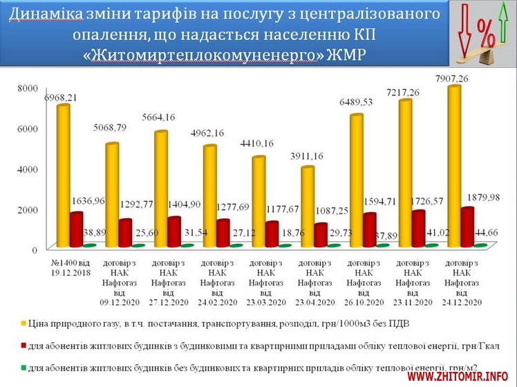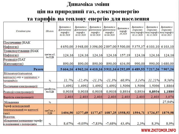 Як повідомляв Житомир.info, відповідно до рішення виконкому Житомирської міської ради від 30 грудня 2020 року, з січня 2021 року тариф на теплову енергію та послуги з централізованого опалення у Житомирі зріс на 18%. Крім того, з січня 2021 року в Житомирі зріс тариф і на водопостачання та водовідведення на 16%. Щодо приватних компаній, то з 1 січня 2021 тариф на розподіл газу АТ «Житомиргаз» становитиме 2,02 грн збільшення на 70%. Також на засіданні 28 грудня 2020 року Уряд схвалив постанову, відповідно до якої скасовується пільгова ціна на електроенергію за перші 100 кВт, а прем’єр-міністр доручив перевірити обґрунтованість цін на газ для населення.