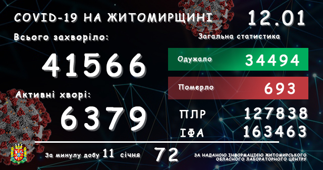 Станом на 09:00 год. 12 січня 2021 в Житомирській області лабораторно підтвердили 41566 випадків коронавірусної хвороби. За минулу добу, 11 січня, зареєстрували 72 випадки COVID-19. За період пандемії померли 693 пацієнти, у тому числі 8 – минулої доби. Одужало загалом 34494 особи.