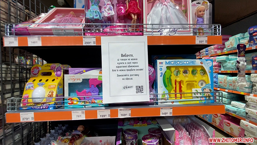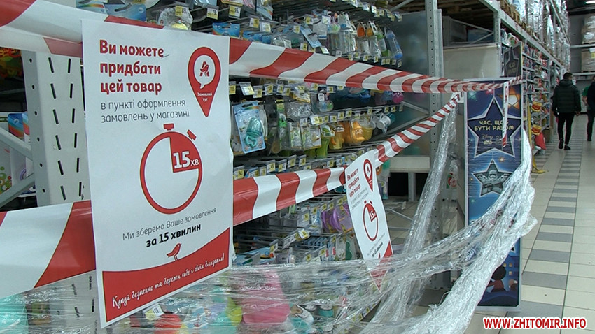 В гіпермаркеті «Ашан», який знаходиться в ТЦ «Глобал», стрічками перекритий доступ до деяких дитячих товарів, іграшок, відділів з текстилем, посудом, книгами та одягом. Втім, все це можна придбати онлайн і забрати в магазині в пункті видачі товарів. Крім того, замовлення можна оформити на території магазину.