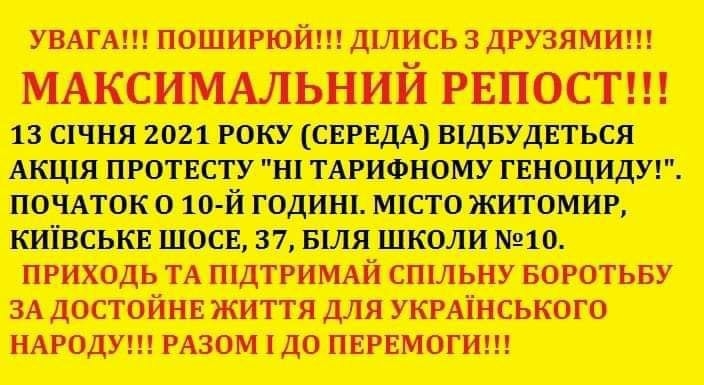 Зазначимо, що 12 січня у Facebook-мережі активно поширюють дописи з закликами приєднатися до акції протесту «Ні тарифному геноциду», початок якої запланований на 10:00 год. 13 січня. Місце проведення – Київське шосе, 37.