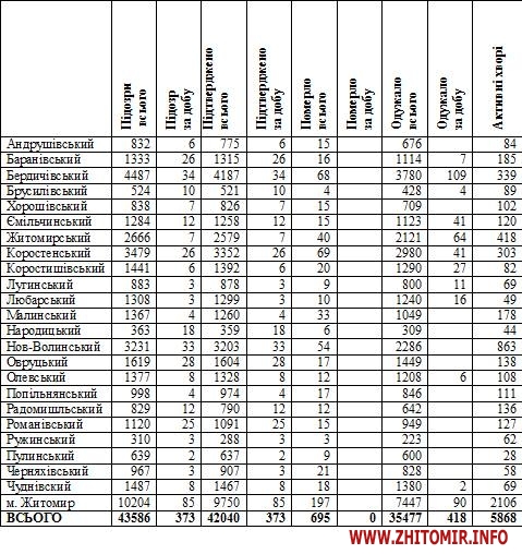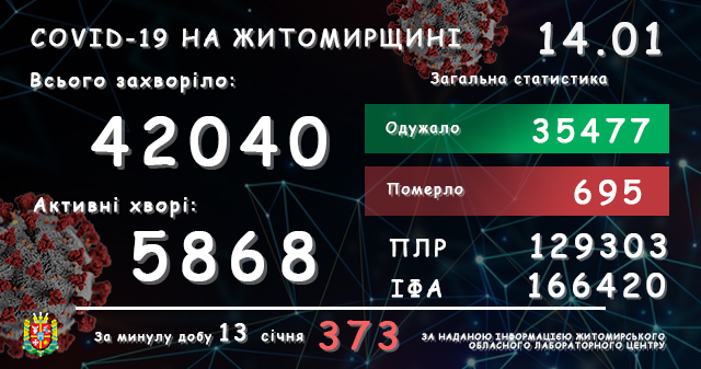 Станом на 09:00 год. 14 січня в Житомирській області лабораторно підтвердили 42040 випадків коронавірусної хвороби. За минулу добу, 13 січня, зареєстрували 373 нові випадки. За період пандемії від ускладнень COVID-19 померли 695 пацієнтів, минулої доби не зафіксували жодного летального випадку. Одужало загалом 35477 осіб.