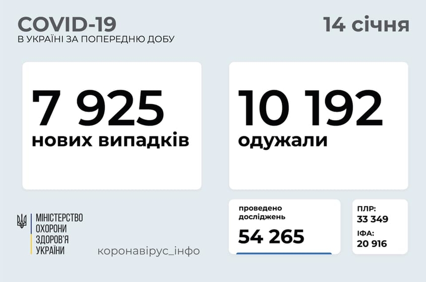 За даними Міністра охорони здоров’я Максима Степанова, станом на 14 січня 2021 року (за добу 13 січня) в Україні зафіксовано 7 925 нових випадків коронавірусної хвороби COVID-19. Зокрема, захворіли 233 дитини та 345 медпрацівників.