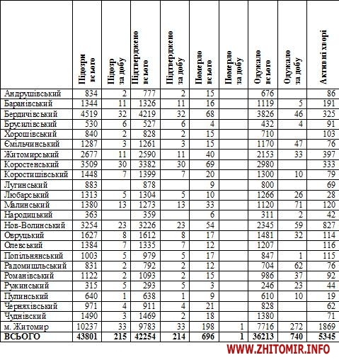 Станом на 09:00 год. 15 січня 2021 року в Житомирській області лабораторно підтвердили 42254 випадків коронавірусної хвороби. За минулу добу, 14 січня, зареєстрували 214 нових випадків. Померло загалом 696 хворих, у тому числі минулої доби зафіксували один летальний випадок. Одужало загалом 36213 осіб.