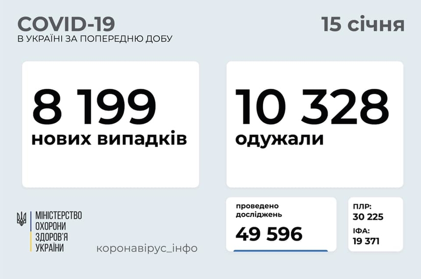 За даними Міністра охорони здоров’я Максима Степанова, станом на 15 січня 2021 року (за добу 14 січня) в Україні зафіксовано 8 199 нових випадків коронавірусної хвороби COVID-19. Зокрема, захворіли 236 дітей та 315 медпрацівників.