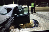 На фото видно тіло людини, яке лежить біля автомобіля.