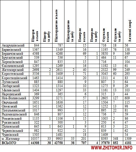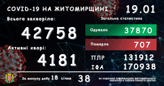Станом на 9:00 год. 19 січня 2021 року в Житомирській області лабораторно підтвердили 42758 випадків коронавірусної хвороби. За минулу добу, 18 січня, обласний лабораторний центр зробив 185 ПЛР-тестів та підтвердив 38 випадків COVID-19. За період пандемії від ускладнень хвороби померли 707 пацієнтів, у тому числі четверо – минулої доби. Одужало загалом 37870 осіб.