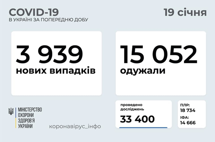 За даними Міністра охорони здоров’я Максима Степанова, станом на 19 січня 2021 року (за добу 18 січня) в Україні зафіксовано 3 939 нових випадків коронавірусної хвороби COVID-19. Зокрема, захворіли 131 дитина та 238 медпрацівників.